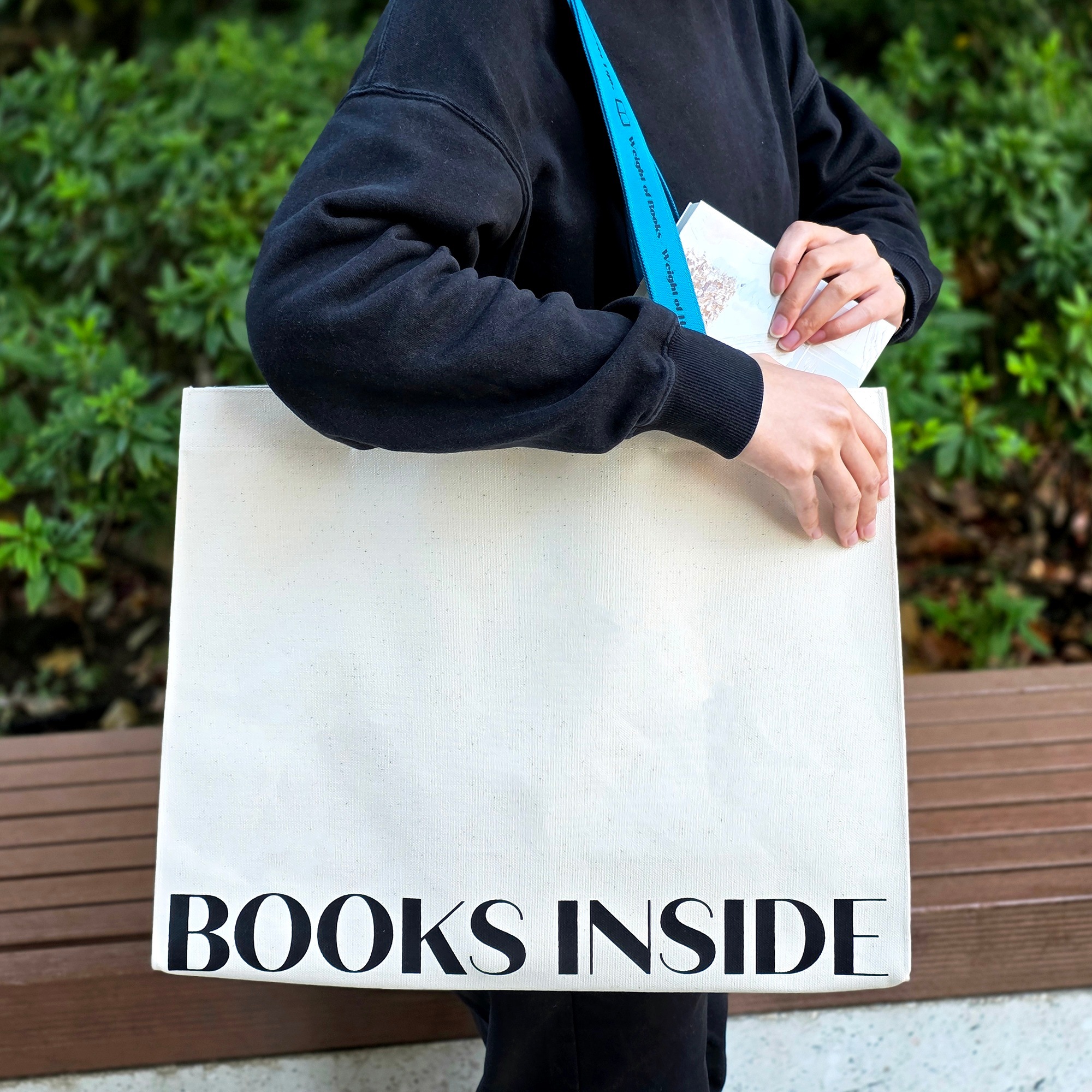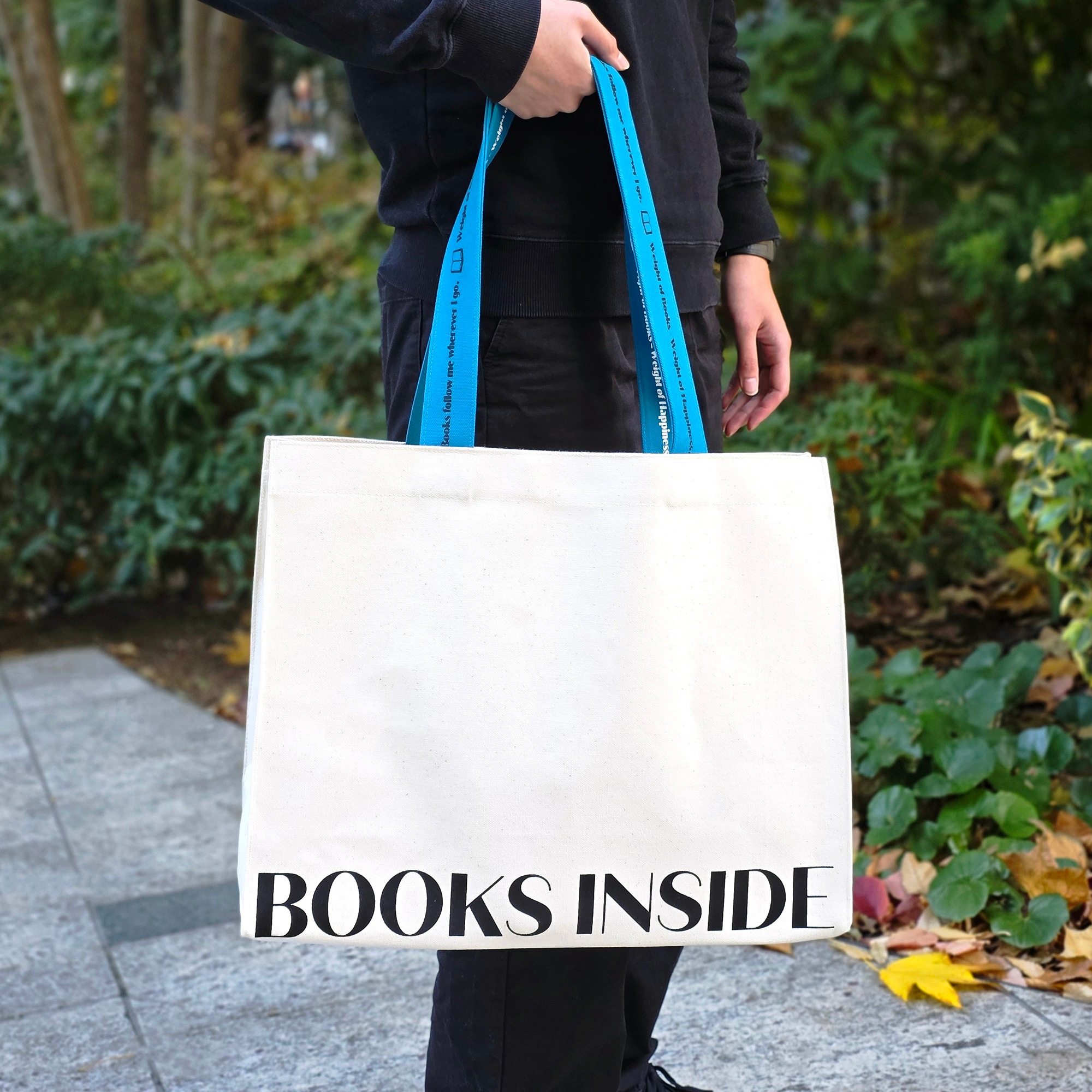 「BOOKS INSIDE(この中に本がいます)」の文言が入ったシンプルなトートバッグ。